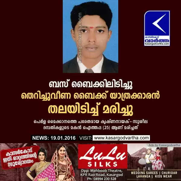 പെര്ള: (www.kasargodvartha.com 19/01/2016) ബസ് ബൈക്കിലിടിച്ചതിനെതുടര്ന്ന് തെറിച്ചുവീണ യുവാവ് തലയിടിച്ച് മരിച്ചു. പെര്ള മൈക്കാനത്തെ പരേതരായ കൃഷ്ണനായക്-സുശീല ദമ്പതികളുടെ മകന് ഐത്തപ്പ (25) ആണ് മരിച്ചത്. തിങ്കളാഴ്ച വൈകിട്ട് കര്ണാടക അര്ളപ്പദവിലായിരുന്നു അപകടം.