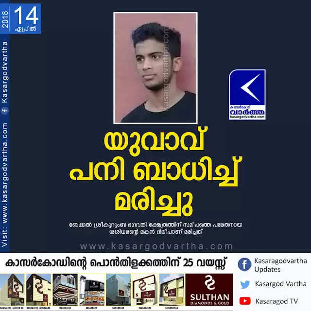 കാസർകോട്: (www.kasargodvartha.com 14.04.2018) യുവാവ് പനി ബാധിച്ച് മരിച്ചു. ബേക്കൽ ശ്രീകുറുംബ ഭഗവതി ക്ഷേത്രത്തിന് സമീപത്തെ പരേതനായ ശശിധരന്റെ മകൻ ദിലീപാ (24) ണ് മരിച്ചത്.