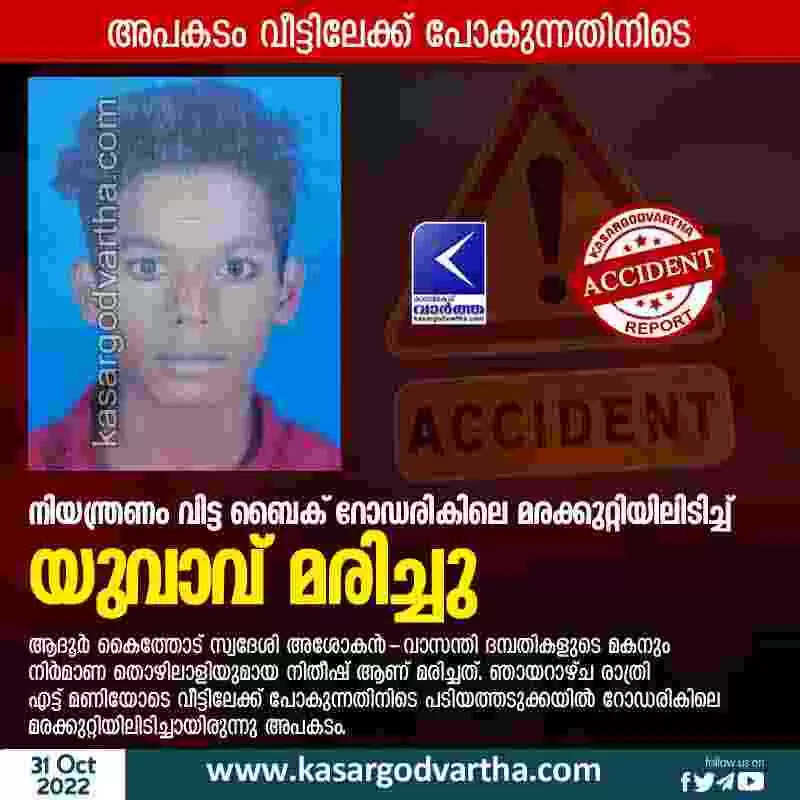 Keywords: Adhur, Kasaragod, Kerala, news, Top-Headlines, Bike, Youth, Death, Obituary, Police, Investigation, Youth died in bike accident.
