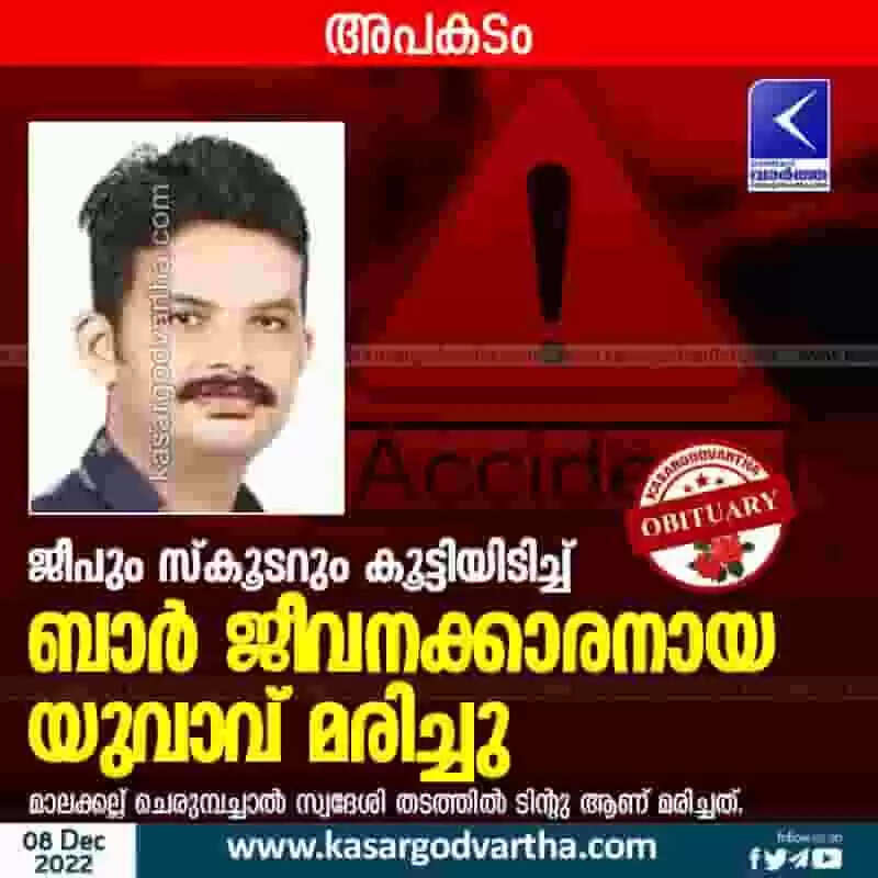 Youth died | ജീപും സ്കൂടറും കൂട്ടിയിടിച്ച് ബാര് ജീവനക്കാരനായ യുവാവ് മരിച്ചു