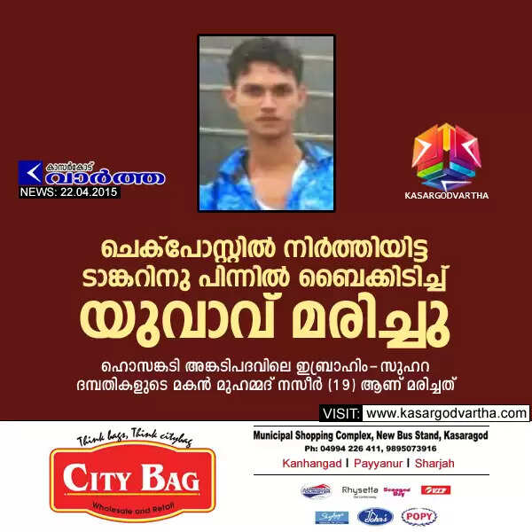 ചെക്പോസ്റ്റില് നിര്ത്തിയിട്ട ടാങ്കറിനു പിന്നില് ബൈക്കിടിച്ച് യുവാവ് മരിച്ചു