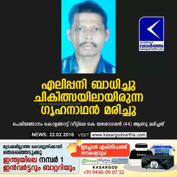 നീലേശ്വരം: (www.kasargodvartha.com 22/02/2016) എലിപ്പനി ബാധിച്ചു ചികിത്സയിലായിരുന്ന ഗൃഹനാഥന് മരിച്ചു. പെരിയങ്ങാനം കൊളങ്ങാട്ട് വീട്ടിലെ കെ. യശോധരന് (44) ആണു മരിച്ചത്.