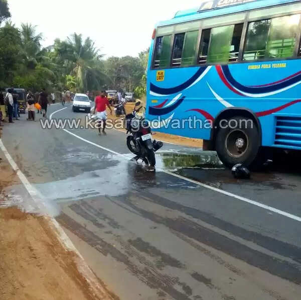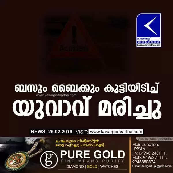 അംഗടിമുഗറില്നിന്നും പെര്ലയിലേക്ക് പോവുകയായിരുന്ന മഹാലക്ഷ്മി ബസും യുവാവ് സഞ്ചരിച്ച ബൈക്കും കൂട്ടിയിടിക്കുകയായിരുന്നു. അംഗടിമുഗര് നടുമൂല സ്വദേശിയാണ് മരിച്ച ശരത്. കുമ്പള പോലീസ് സ്ഥലത്തെത്തി മൃതദേഹം കാസര്കോട് ജനറല് ആശുപത്രിയിലേക്ക് കൊണ്ടുപോയി.