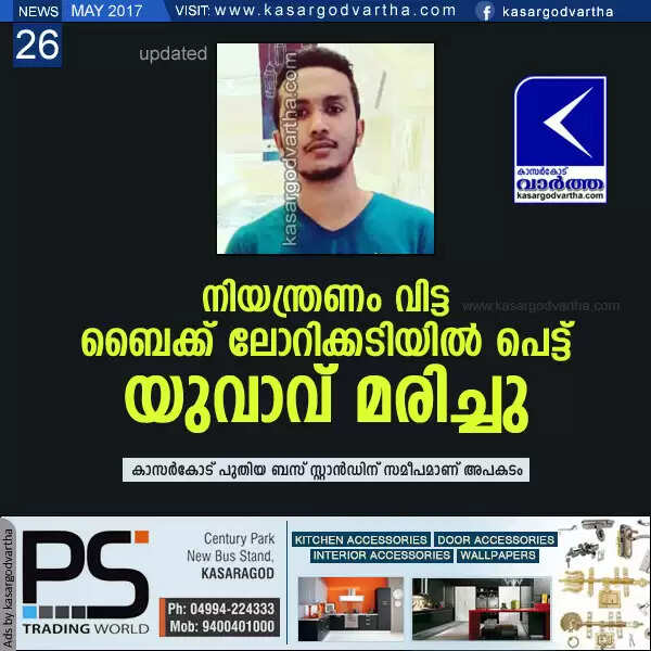 ഒരു കാറിനെ മറികടന്ന് പോകുന്നതിനിടെ ബൈക്കിന്റെ നിയന്ത്രണം വിട്ട് മറിയുകയും ലോറിക്കടിയില്‍ പെടുകയുമായിരുന്നു. അപകടത്തെ തുടര്‍ന്ന് ലോറി നിര്‍ത്താതെ പോയി. വിവരമറിയിച്ചതിന്റെ അടിസ്ഥാനത്തിലെത്തിയ പോലീസും നാട്ടുകാരും ചേര്‍ന്ന് മൊഗ്രാല്‍ പുത്തൂരില്‍ വെച്ച് അപകടം വരുത്തിയ ലോറി പിടികൂടി. www.kasargodvartha.com