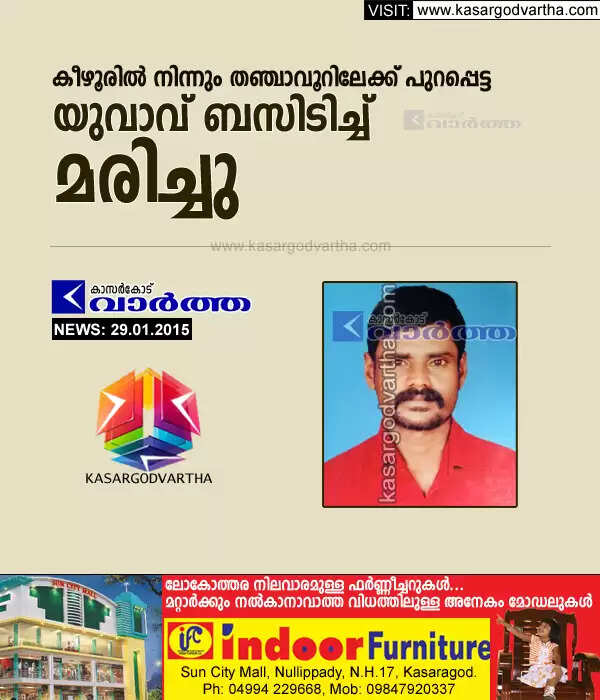 കീഴൂരില്‍ നിന്നും തഞ്ചാവൂറിലേക്ക് പുറപ്പെട്ട യുവാവ് ട്രാന്‍സ്‌പോര്‍ട്ട് ബസിടിച്ച് മരിച്ചു