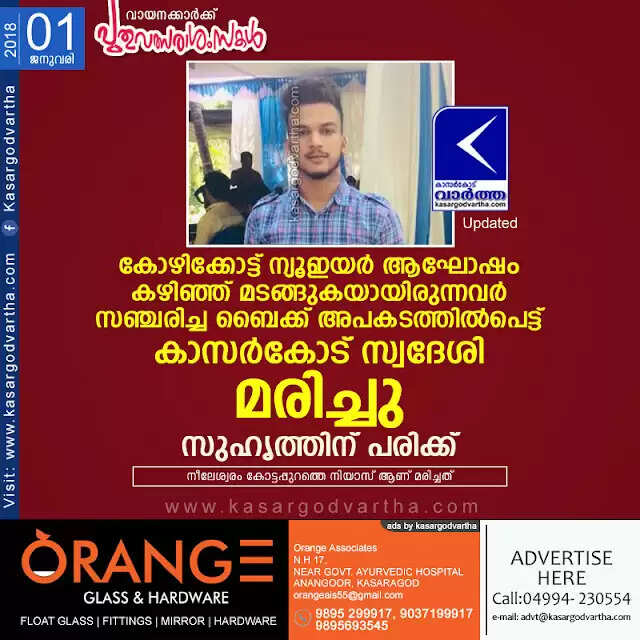 Keywords: Kasaragod, Kerala, news, Neeleswaram, Death, Accidental-Death, Youth, Top-Headlines, Kozhikode, Youth dies in Bike accident; friend injured