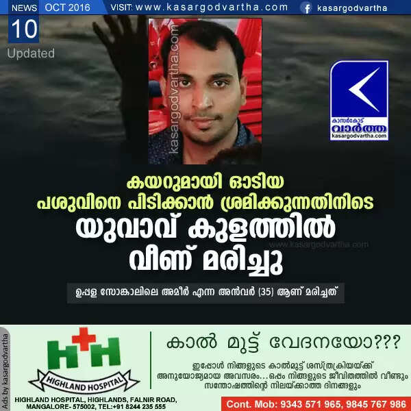 ഉപ്പള: (www.kasargodvartha.com 10.10.2016) കയറുമായി ഓടിയ പശുവിനെ പിടിക്കാന്‍ ശ്രമിക്കുന്നതിനിടെ യുവാവ് അബദ്ധത്തില്‍ കുളത്തില്‍ വീണ് മരിച്ചു. ഉപ്പള സോങ്കാലിലെ അബ്ബാസിന്റെ മകന്‍ അമീര്‍ എന്ന അന്‍വര്‍ (35) ആണ് മരിച്ചത്. തിങ്കളാഴ്ച രാത്രി 7.30 മണിയോടെയാണ് മൃതദേഹം കണ്ടെത്തിയത്.