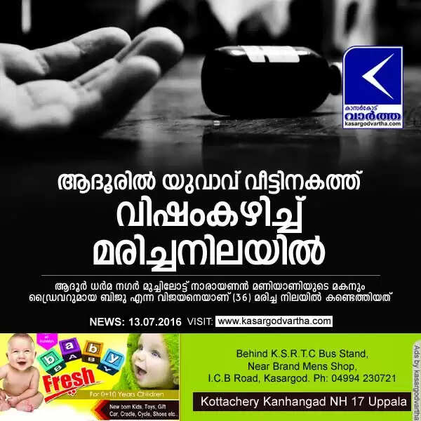 Keywords: Adhur, Kasaragod, Obituary, Kerala, Biju, Poison, Hospital, Vijayam, Driver, Youth found dead after consuming poison