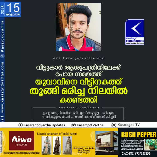ഉപ്പള: (www.kasargodvartha.com 15.10.2018) വീട്ടുകാര് ആശുപത്രിയിലേക്ക് പോയ സമയത്ത് യുവാവിനെ വീട്ടിനകത്ത് തൂങ്ങി മരിച്ച നിലയില് കണ്ടെത്തി. ഉപ്പള ജനപ്രിയയിലെ ബി എസ് അബ്ദുല്ല - മറിയുമ്മ ദമ്പതികളുടെ മകന് ഫയാസ് മൊയ്തീന് (23) ആണ് മരിച്ചത്.