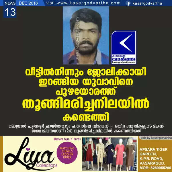 മൊഗ്രാല്‍ പുത്തൂര്‍: (www.kasargodvartha.com 13/12/2016) വീട്ടില്‍നിന്നും ജോലിക്കായി ഇറങ്ങിയ യുവാവിനെ പുഴയോരത്ത് തൂങ്ങിമരിച്ചനിലയില്‍ കണ്ടെത്തി. മൊഗ്രാല്‍ പുത്തൂര്‍ ചായിത്തോട്ടം ഹൗസിലെ വിജയന്‍ - രത്‌ന ദമ്പതികളുടെ മകന്‍ ജയറാമിനെയാണ് (24) തിങ്കളാഴ്ച വൈകിട്ട് മൊഗ്രാല്‍ പുത്തൂര്‍ കൊപ്പളം പുഴയോരത്ത് തൂങ്ങിമരിച്ചനിലയില്‍ കണ്ടെത്തിയത്.