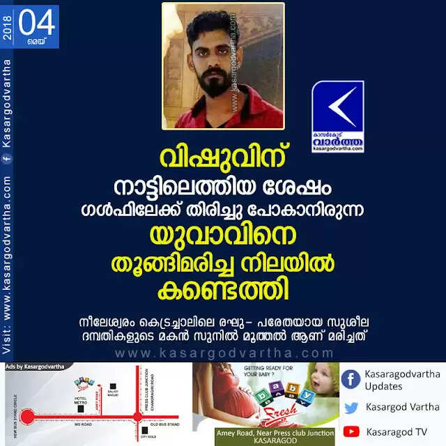 നീലേശ്വരം:(www.kasargodvartha.com 04/05/2018) വിഷുവിന് നാട്ടിലെത്തിയ ശേഷം ഗള്ഫിലേക്ക് തിരിച്ചു പോകാനിരുന്ന യുവാവിനെ തൂങ്ങിമരിച്ച നിലയില് കണ്ടെത്തി.നീലേശ്വരം കെട്രച്ചാലിലെ രഘു- പരേതയായ സുശീല