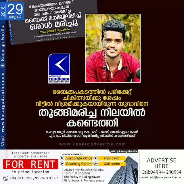 ചെറുവത്തൂര്: (www.kasargodvartha.com 29.01.2018) ബൈക്കപകടത്തില് പരിക്കേറ്റ് ചികിത്സയ്ക്കു ശേഷം വീട്ടില് വിശ്രമിക്കുകയായിരുന്ന യുവാവിനെ തൂങ്ങിമരിച്ച നിലയില് കണ്ടെത്തി. ചെറുവത്തൂര് കാടങ്കോട്ടെ കെ. രവി- രമണി ദമ്പതികളുടെ മകന് എം കെ വിപിനെ (20)യാണ് വീടിനോട് ചേര്ന്നുള്ള പമ്പ് ഹൗസില് തൂങ്ങിമരിച്ച നിലയില് കണ്ടെത്തിയത്.
