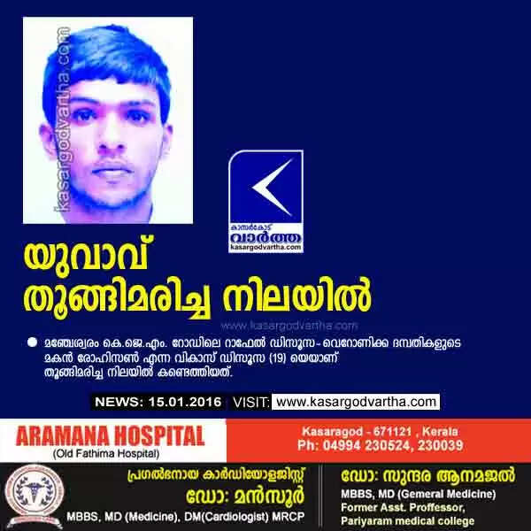 ഉപ്പള: (www.kasargodvartha.com 15/01/2016) യുവാവിനെ തൂങ്ങിമരിച്ച നിലയില് കണ്ടെത്തി. മഞ്ചേശ്വരം കെ.ജെ.എം. റോഡിലെ റാഫേല് ഡിസൂസ-വെറോണിക്ക ദമ്പതികളുടെ മകന് രോഹിസണ് എന്ന വികാസ് ഡിസൂസ (19) യെയാണ് വീട്ടിനകത്തെ ഫാനില് തൂങ്ങിമരിച്ച നിലയില് കണ്ടെത്തിയത്.