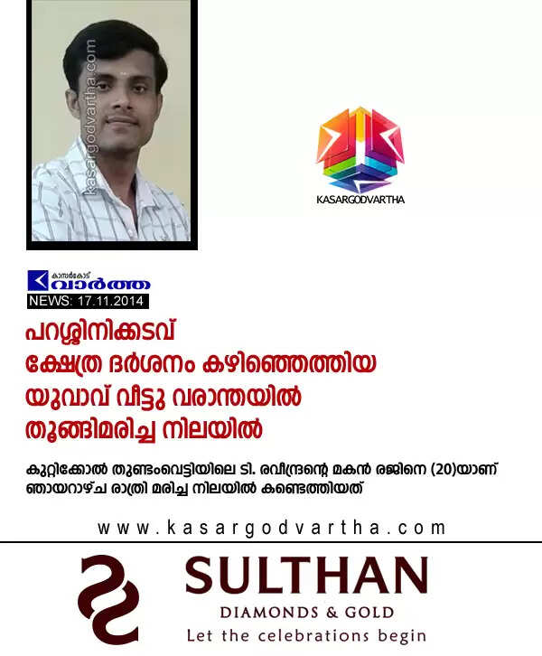 പറശ്ശിനിക്കടവ് ക്ഷേത്ര ദര്ശനം കഴിഞ്ഞെത്തിയ യുവാവ് വീട്ടു വരാന്തയില് തൂങ്ങിമരിച്ച നിലയില്