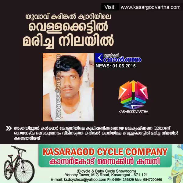 കുമ്പള: (www.kasargodvartha.com 01/06/2015) യുവാവിനെ കരിങ്കല് ക്വാറിയിലെ വെള്ളക്കെട്ടില് മരിച്ച നിലയില് കണ്ടെത്തി. അംഗഡിമുഗര് കള്ക്കാര് കോളനിയിലെ കൂലിപ്പണിക്കാരനായ രാമകൃഷ്ണനെ (22)യാണ് ഞായറാഴ്ച വൈകുന്നേരം വീടിനടുത്ത കരിങ്കല് ക്വാറിയിലെ വെള്ളക്കെട്ടില് മരിച്ച നിലയില് കണ്ടെത്തിയത്.