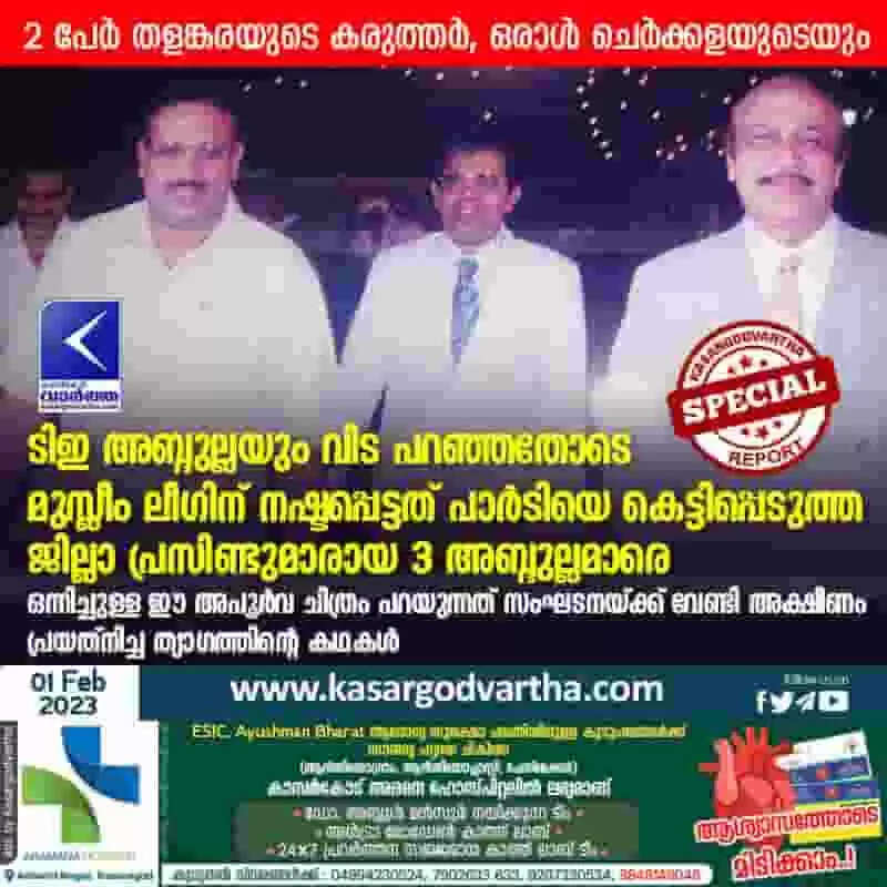 Muslim League | ടിഇ അബ്ദുല്ലയും വിട പറഞ്ഞതോടെ മുസ്ലീം ലീഗിന് നഷ്ടപ്പെട്ടത് പാര്‍ടിയെ കെട്ടിപ്പെടുത്ത ജില്ലാ പ്രസിണ്ടുമാരായ 3 അബ്ദുല്ലമാരെ; ഒന്നിച്ചുള്ള ഈ അപൂര്‍വ ചിത്രം പറയുന്നത് സംഘടനയ്ക്ക് വേണ്ടി അക്ഷീണം പ്രയത്‌നിച്ച ത്യാഗത്തിന്റെ കഥകള്‍; 2 പേര്‍ തളങ്കരയുടെ കരുത്തര്‍, ഒരാള്‍ ചെര്‍ക്കളയുടെയും