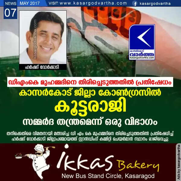 തദ്ദേശതിരഞ്ഞെടുപ്പില്‍ മഞ്ചേശ്വരം ഡിവിഷനില്‍ ഹര്‍ഷദ് വോര്‍ക്കാടിക്കെതിരെ ഡി എം കെ മുഹമ്മദ് വിമതനായി മല്‍സരിച്ചിരുന്നു. ഇതേ തുടര്‍ന്നാണ് വിമതനെ കോണ്‍ഗ്രസില്‍ നിന്നും പുറത്താക്കിയത്. വിമതനായി മല്‍സരിച്ചതിനുശേഷവും സി പി എമ്മിനെ സഹായിക്കുന്ന നിലപാടുകളാണ് മുഹമ്മദ് സ്വീകരിച്ചതെന്ന ആരോപണം കോണ്‍ഗ്രസില്‍ ശക്തമാണ്. ജില്ലപഞ്ചായത്ത് സ്റ്റാന്‍ഡിംഗ് കമ്മിറ്റി ചെയര്‍മാന്‍ സ്ഥാനം രാജിവെച്ചതായി ഹര്‍ഷദ് വോര്‍ക്കാടി പാര്‍ട്ടി നേതൃത്വത്തിനാണ് ഇപ്പോള്‍ കത്ത് നല്‍കിയിട്ടുള്ളത്. ജില്ലാപഞ്ചായത്ത് പ്രസിഡണ്ടിനും കത്ത് കൈമാറും.