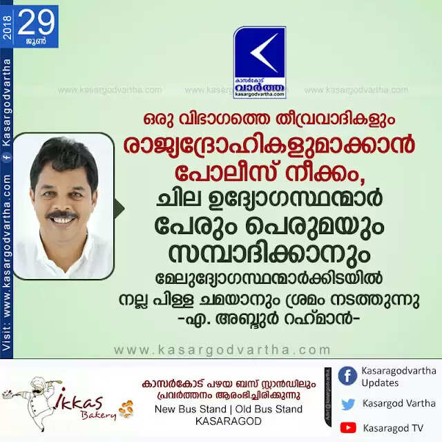 ഒരു വിഭാഗത്തെ തീവ്രവാദികളും രാജ്യദ്രോഹികളുമാക്കാന്‍ പോലീസ് നീക്കം, ചില ഉദ്യോഗസ്ഥന്മാര്‍ പേരും പെരുമയും സമ്പാദിക്കാനും മേലുദ്യോഗസ്ഥന്മാര്‍ക്കിടയില്‍ നല്ല പിള്ള ചമയാനും ശ്രമം നടത്തുന്നു: എ. അബ്ദുര്‍ റഹ് മാന്‍