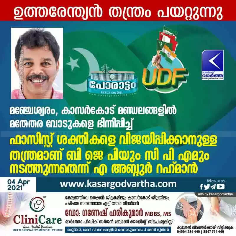 മഞ്ചേശ്വരം, കാസർകോട് മണ്ഡലങ്ങളിൽ മതേതര വോടുകളെ ഭിന്നിപ്പിച്ച് ഫാസിസ്റ്റ് ശക്തികളെ വിജയിപ്പിക്കാനുള്ള തന്ത്രമാണ് ബി ജെ പിയും സി പി എമും നടത്തുന്നതെന്ന് എ അബ്ദുർ റഹ്മാൻ