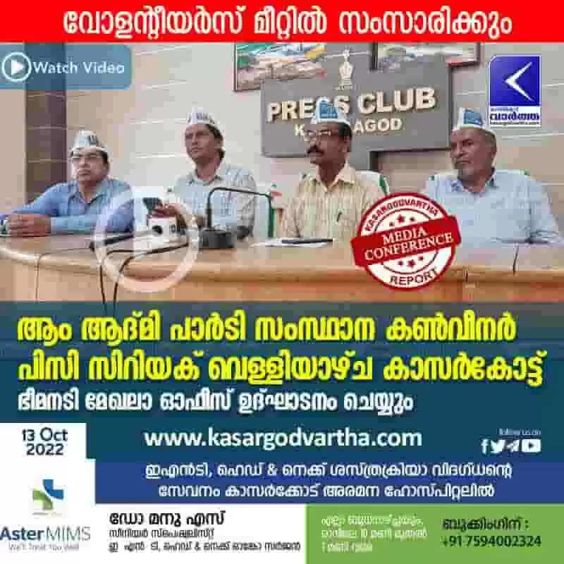 Aam Aadmi Party | ആം ആദ്മി പാര്ടി സംസ്ഥാന കണ്വീനര് പിസി സിറിയക് വെള്ളിയാഴ്ച കാസര്കോട്ട്; ഭീമനടി മേഖലാ ഓഫീസ് ഉദ്ഘാടനം ചെയ്യും