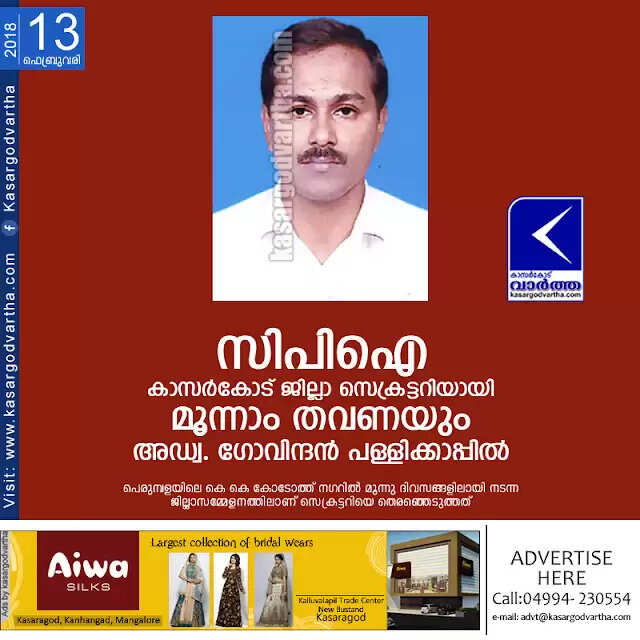 സിപിഐ കാസര്കോട് ജില്ലാ സെക്രട്ടറിയായി മൂന്നാം തവണയും അഡ്വ. ഗോവിന്ദന് പള്ളിക്കാപ്പില്