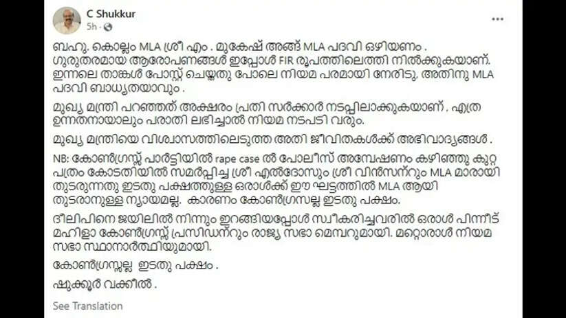 Demand | മുകേഷ് എംഎൽഎ പദവി ഒഴിയണമെന്ന് അഡ്വ. സി ഷുക്കൂർ; ‘കോൺഗ്രസ് അല്ല ഇടതുപക്ഷം’