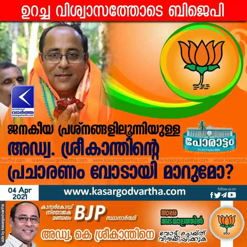 ജനകീയ പ്രശ്നങ്ങളിലൂന്നിയുള്ള അഡ്വ. ശ്രീകാന്തിന്റെ പ്രചാരണം വോടായി മാറുമോ? ഉറച്ച വിശ്വാസത്തോടെ ബിജെപി