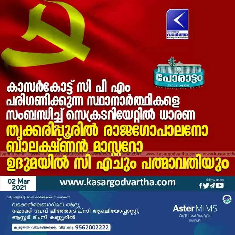 കാസർകോട്ട് സി പി എം പരിഗണിക്കുന്ന സ്ഥാനാർത്ഥികളെ സംബന്ധിച്ച് സെക്രടറിയേറ്റിൽ ധാരണ; തൃക്കരിപ്പൂരിൽ രാജഗോപാലനോ ബാലക്ഷ്ണൻ മാസ്റ്ററോ; ഉദുമയിൽ സി എചും പത്മാവതിയും