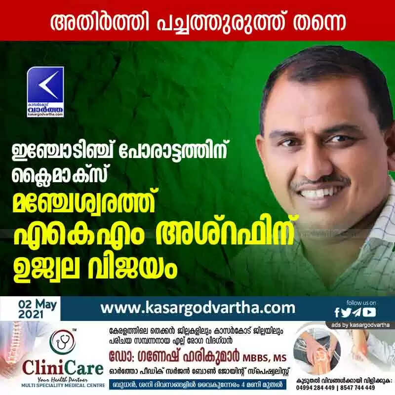 ഇഞ്ചോടിഞ്ച് പോരാട്ടത്തിന് ക്ലൈമാക്സ്; മഞ്ചേശ്വരത്ത് എകെഎം അശ്റഫിന് ഉജ്വല വിജയം