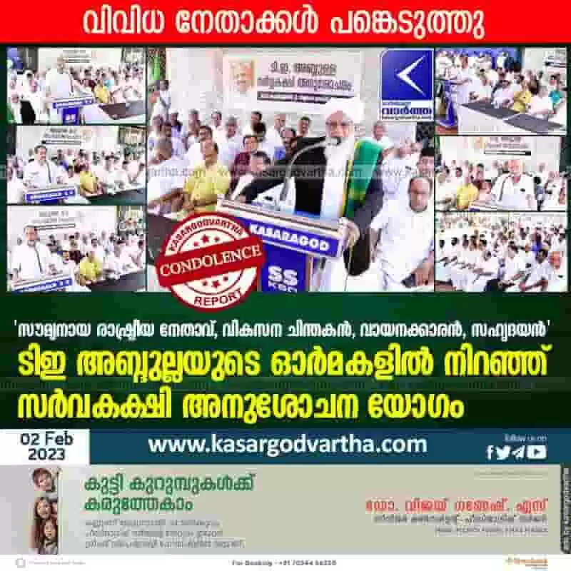 Keywords: Latest-News, Kerala, Kasaragod, Top-Headlines, Condolence, Obituary, Muslim-League, T.E Abdulla, Political-News, Politics, Remembrance, Remembering, All-party condolence meeting held with memories of TE Abdulla.