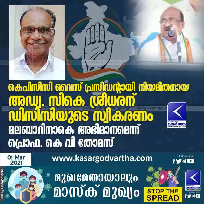 കാസർകോട്: (www.kasargodvartha.com 01.03.2021) കേരള പ്രദേശ് കോണ്ഗ്രസ് കമിറ്റിയുടെ വൈസ് പ്രസിഡണ്ട് ആയി അഡ്വ. സി കെ ശ്രീധരന്റെ നിയമനം മലബാറിനാകെ ജനാധിപത്യ പ്രസ്ഥാനത്തിന് അഭിമാനമാണ് എന്ന് പ്രൊഫ. കെ വി തോമസ് പറഞ്ഞു. കെപിസിസി വൈസ് പ്രസിഡണ്ടായി നിയമിതനായ അഡ്വ. സി കെ ശ്രീധരനെ ജില്ലാ കോണ്ഗ്രസ് കമിറ്റിയുടെ നേതൃത്വത്തില് നടത്തിയ അനുമോദന യോഗം ഉദ്ഘാടനം ചെയ്തു സംസാരിക്കുകയായിരുന്നു അദ്ദേഹം.