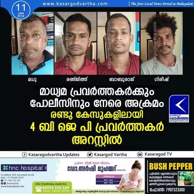 മാധ്യമ പ്രവര്ത്തകര്ക്കും പോലീസിനും നേരെ അക്രമം; രണ്ടു കേസുകളിലായി 4 ബി ജെ പി പ്രവര്ത്തകര് അറസ്റ്റില്