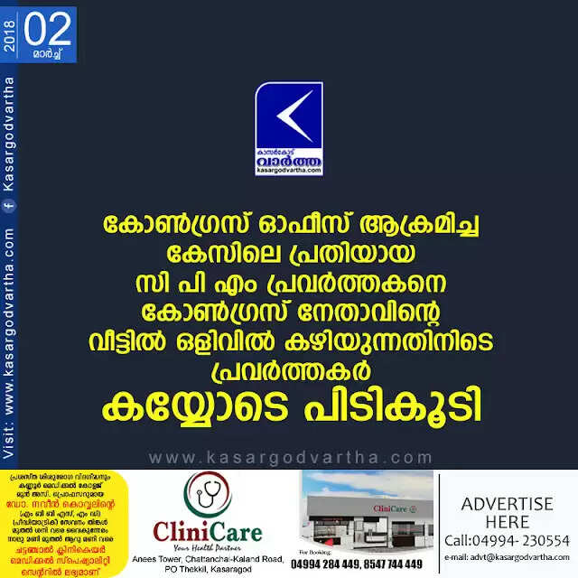 കോണ്ഗ്രസ് ഓഫീസ് ആക്രമിച്ച കേസിലെ പ്രതിയായ സി പി എം പ്രവര്ത്തകനെ കോണ്ഗ്രസ് നേതാവിന്റെ വീട്ടില് ഒളിവില് കഴിയുന്നതിനിടെ പ്രവര്ത്തകര് കയ്യോടെ പിടികൂടി