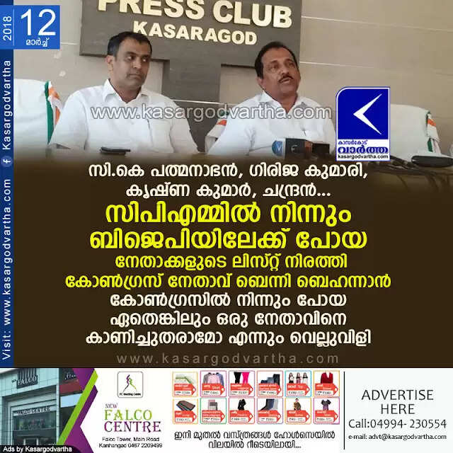 Keywords: Kasaragod, Kerala, news, CPM, Congress, Top-Headlines, Political party, Politics, Benny Behnan against CPM