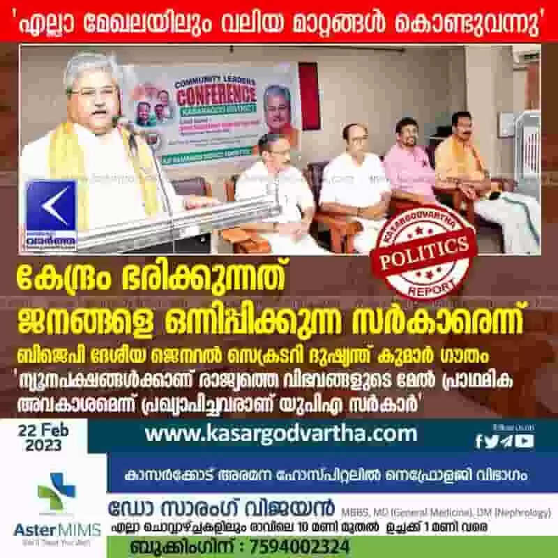 Keywords:  Latest-News, Kerala, Kasaragod, Politics, Political-News, BJP, Conference, Government, Top-Headlines, Dushyant Kumar, BJP National General Secretary says Central Government unites people.