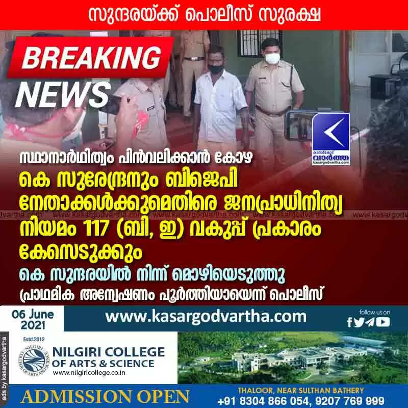 Keywords:  Kerala, News, Kasaragod, Top-Headlines, Police, Politics, Political party, BJP, LDF, Vote, Bribe, Candidate, Photo, Manjeshwaram, K.Surendran, Case, K Sundara, Bribe to withdraw candidature; K Surendran and BJP leaders to be prosecuted under Section 117 (b, e) of the Representation of the People Act.