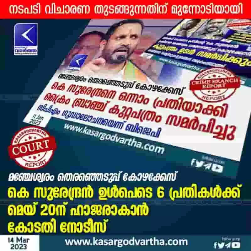 Bribery case | മഞ്ചേശ്വരം തെരഞ്ഞെടുപ്പ് കോഴക്കേസ്: കെ സുരേന്ദ്രന് ഉള്പെടെ 6 പ്രതികള്ക്ക് മെയ് 20ന് ഹാജരാകാന് കോടതി നോടീസ്