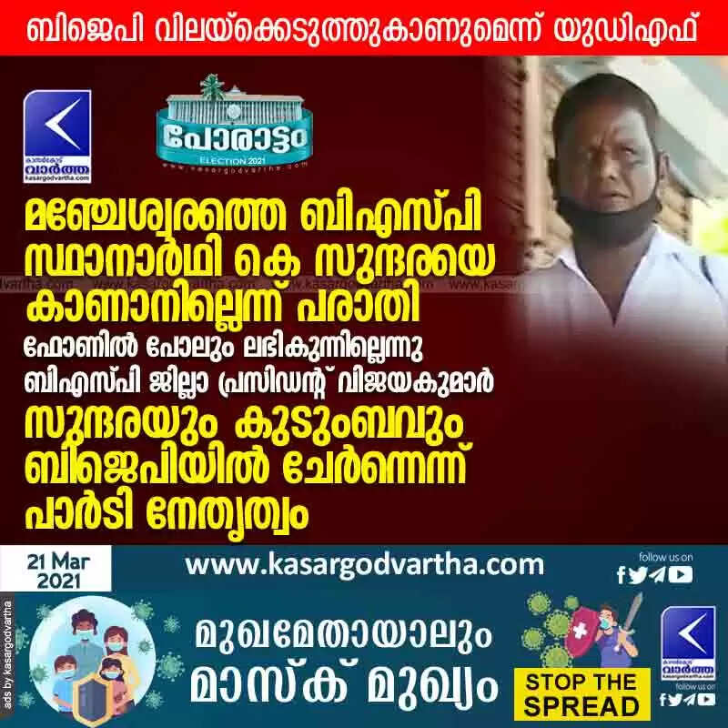 മഞ്ചേശ്വരത്തെ ബിഎസ്പി സ്ഥാനാർഥി കെ സുന്ദരയെ കാണാനില്ലെന്ന് പരാതി; ഫോണിൽ പോലും ലഭികുന്നില്ലെന്നു ബിഎസ്പി ജില്ലാ പ്രസിഡന്റ് വിജയകുമാർ; സുന്ദരയും കുടുംബവും ബി ജെ പിയിൽ ചേർന്നെന്ന് പാർടി നേതൃത്വം