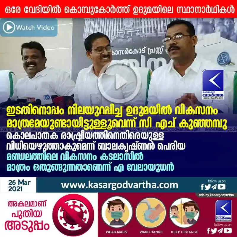 ഒരേ വേദിയിൽ കൊമ്പ് കോർത്ത് ഉദുമയിലെ സ്ഥാനാർഥികൾ; ഇടതിനൊപ്പം നിലയുറപ്പിച്ച ഉദുമയില് വികസനം മാത്രമേയുണ്ടായിട്ടുള്ളൂവെന്ന് സി എച് കുഞ്ഞമ്പു, കൊലപാതക രാഷ്ട്രീയത്തിനെതിരെയുള്ള വിധിയെഴുത്താകുമെന്ന് ബാലകൃഷ്ണൻ പെരിയ, മണ്ഡലത്തിലെ വികസനം കടലാസില് മാത്രം ഒതുങ്ങുന്നതാണെന്ന് എ വേലായുധൻ