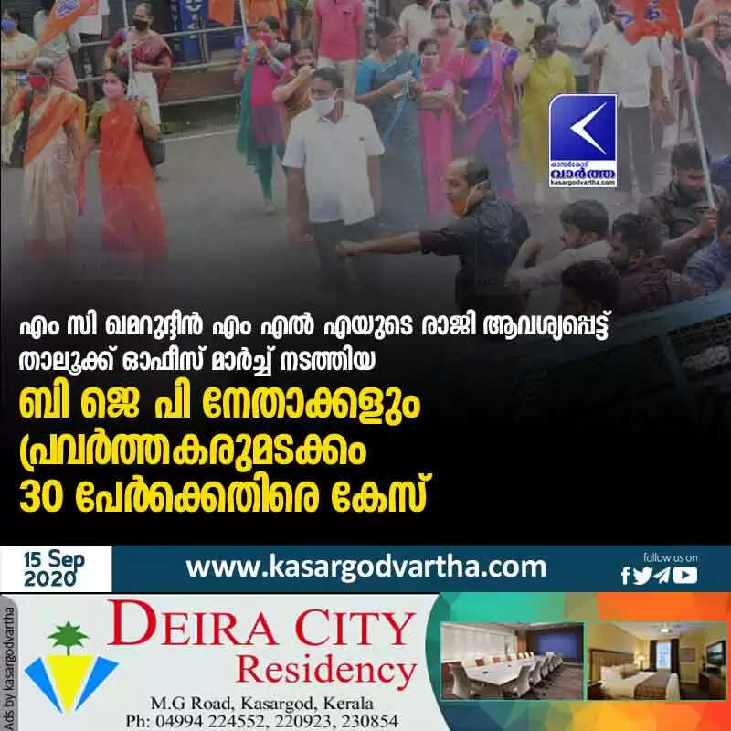 എം സി ഖമറുദ്ദീൻ എം എൽ എയുടെ രാജി ആവശ്യപ്പെട്ട് താലൂക്ക് ഓഫീസ് മാർച്ച് നടത്തിയ ബി ജെ പി നേതാക്കളും പ്രവർത്തകരുമടക്കം 30 പേർക്കെതിരെ കേസ്