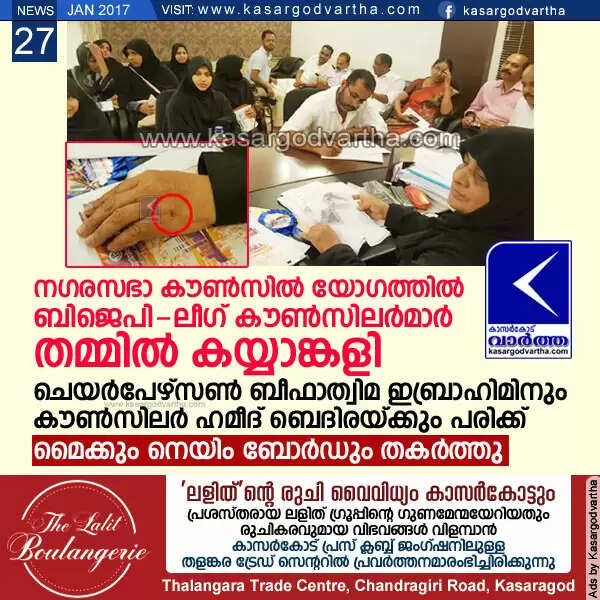 നഗരസഭാ കൗണ്സില് യോഗത്തില് ബിജെപി-ലീഗ് കൗണ്സിലര്മാര് തമ്മില് കയ്യാങ്കളി; ചെയര്പേഴ്സണ് ബീഫാത്വിമ ഇബ്രാഹിമിനും കൗണ്സിലര് ഹമീദ് ബെദിരയ്ക്കും പരിക്ക്; മൈക്കും നെയിം ബോര്ഡും തകര്ത്തു