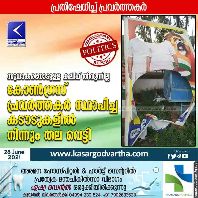 സുധാകരനോടുള്ള കലിപ്പ് തീരുന്നില്ല; കോൺഗ്രസ് പ്രവർത്തകർ സ്ഥാപിച്ച കടൗടുകളിൽ നിന്നും തല വെട്ടി