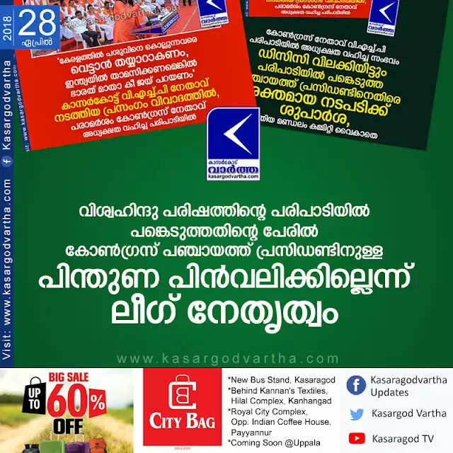 വി എച്ച് പി സംഘടിപ്പിക്കുന്ന ഹിന്ദു സമാജോത്സവത്തില് അധ്യക്ഷത വഹിക്കുന്നത് കോണ്ഗ്രസ് നേതാവായ പഞ്ചായത്ത് പ്രസിഡണ്ട്; പിന്തുണ പിന്വലിക്കുമെന്ന് ലീഗ്, വിലക്കുമായി ഡിസിസി, തീരുമാനം വെള്ളിയാഴ്ച അറിയിക്കുമെന്ന് പഞ്ചായത്ത് പ്രസിഡണ്ട്