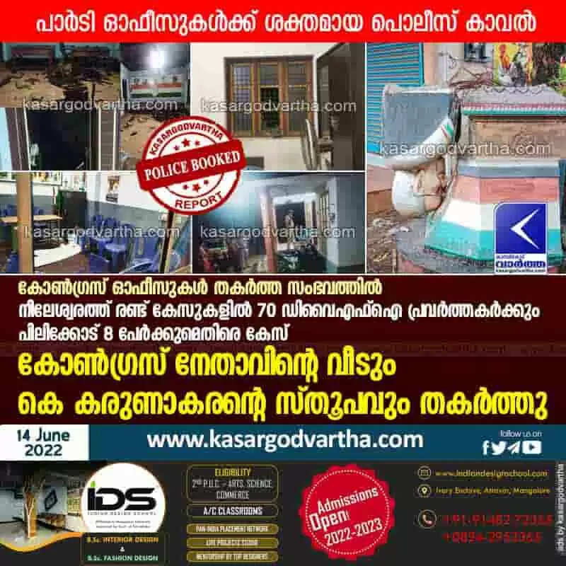 Police Booked | കോണ്ഗ്രസ് ഓഫീസുകള് തകര്ത്ത സംഭവത്തില് നീലേശ്വരത്ത് രണ്ട് കേസുകളില് 70 ഡിവൈഎഫ്ഐ പ്രവര്ത്തകര്ക്കും പിലികോട് 8 പേര്ക്കുമെതിരെ കേസ്; കോണ്ഗ്രസ് നേതാവിന്റെ വീടും കെ കരുണാകരന്റെ സ്തൂപവും തകര്ത്തു; പാര്ടി ഓഫീസുകള്ക്ക് ശക്തമായ പൊലീസ് കാവല്