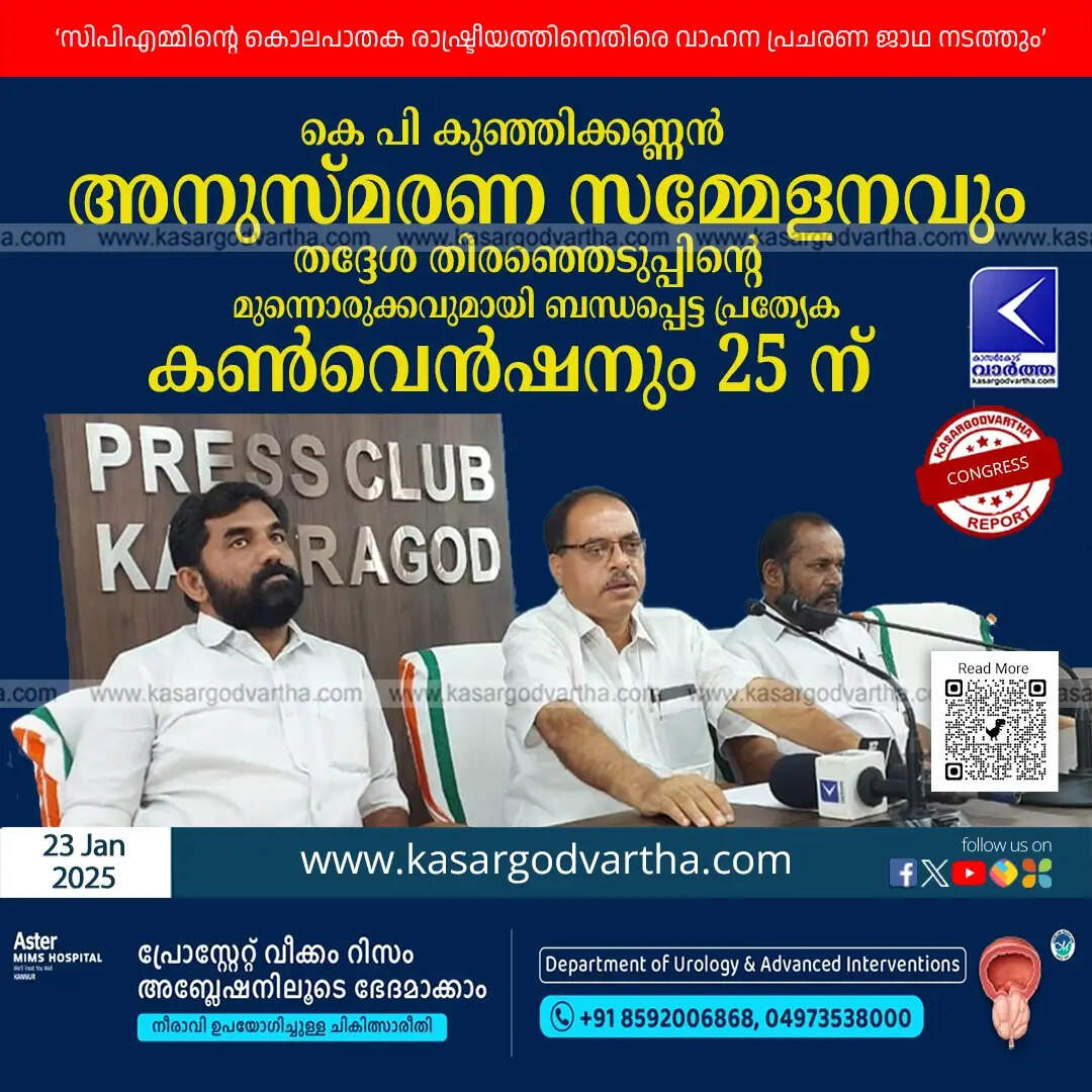 Congress | കെ പി കുഞ്ഞിക്കണ്ണന് അനുസ്മരണ സമ്മേളനവും തദ്ദേശ തിരഞ്ഞെടുപ്പിന്റെ മുന്നൊരുക്കവുമായി ബന്ധപ്പെട്ട പ്രത്യേക കണ്വെന്ഷനും 25 ന്
