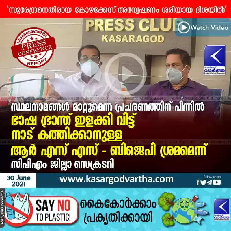 Keywords: Kasaragod, Kerala, News, CPM, BJP, RSS, Politics, Political party, Press meet, Karnataka, District, Secretary, Government, Malayalam, Fake Notes, President, State, K.Surendran, Manjeshwaram, CPM district secretary says RSS-BJP attempt to stir up language madness and set on fire.