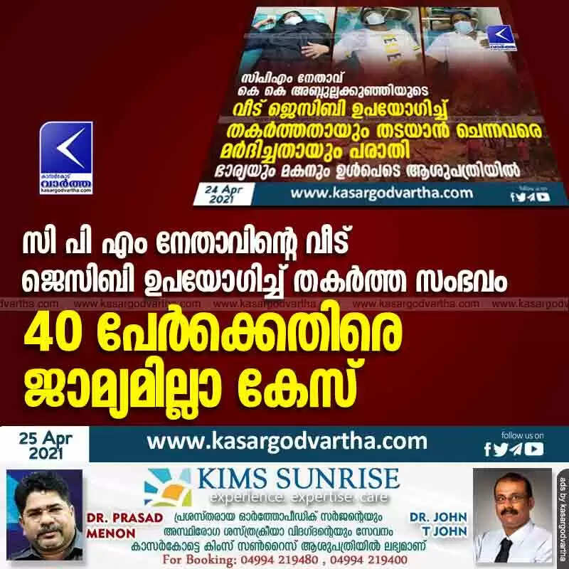 സി പി എം നേതാവിന്റെ വീട് ജെ സി ബി ഉപയോഗിച്ച് തകര്ത്ത സംഭവം; 40 പേര്ക്കെതിരെ ജാമ്യമില്ലാ കേസ്
