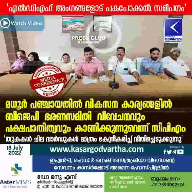 Keywords: News, Kerala, Kasaragod, Top-Headlines, CPM, BJP, Political Party, Politics, Panchayath, Video, Press Meet, LDF, Controversy, Madhur Panchayat, CPM says BJP is showing discrimination and partiality in Madhur Panchayat.