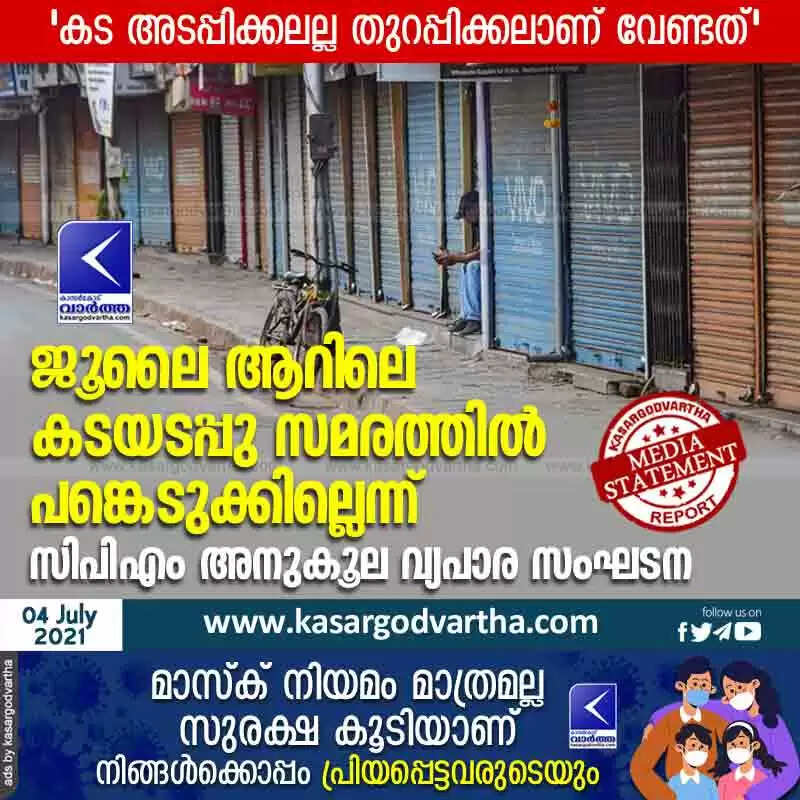 ജൂലൈ ആറിലെ കടയടപ്പു സമരത്തിൽ പങ്കെടുക്കില്ലെന്ന് സിപിഎം അനുകൂല വ്യപാര സംഘടന