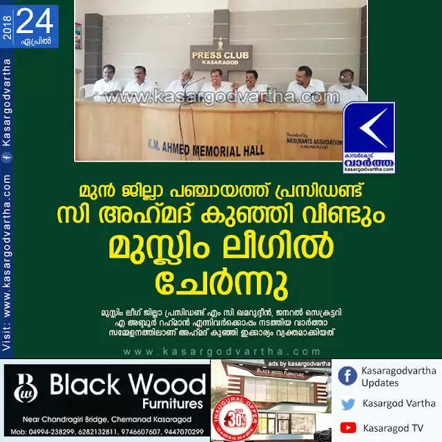 കാസര്‍കോട്: (www.kasargodvartha.com 23.04.2018) മുന്‍ ജില്ലാ പഞ്ചായത്ത് പ്രസിഡണ്ട് സി അഹ് മദ് കുഞ്ഞി വീണ്ടും മുസ്ലിം ലീഗില്‍ ചേര്‍ന്നു. വര്‍ഷങ്ങള്‍ക്കു മുമ്പ് പാര്‍ട്ടി നേതൃത്വവുമായുണ്ടായ അഭിപ്രായ ഭിന്നതയെ തുടര്‍ന്നാണ് താന്‍ പാര്‍ട്ടിയില്‍ നിന്നും പുറത്തുപോയതെന്നും മാറിയ സാഹചര്യത്തില്‍ മാതൃസംഘടനയിലേക്ക് തിരിച്ചുപോവുകയാണെന്നും അഹ് മദ് കുഞ്ഞി മുസ്ലിം ലീഗ് ജില്ലാ പ്രസിഡണ്ട് എം സി ഖമറുദ്ദീന്‍, ജനറല്‍ സെക്രട്ടറി എ അബ്ദുര്‍ റഹ് മാന്‍ എന്നിവര്‍ക്കൊപ്പം നടത്തിയ വാര്‍ത്താ സമ്മേളനത്തില്‍ അറിയിച്ചു.